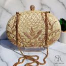 Immerse yourself in regal elegance with this clutch adorned in intricate zardozi embroidery. Its rich texture and refined detailing make it an essential companion for sophisticated evenings, ensuring you stand out with every graceful gesture.